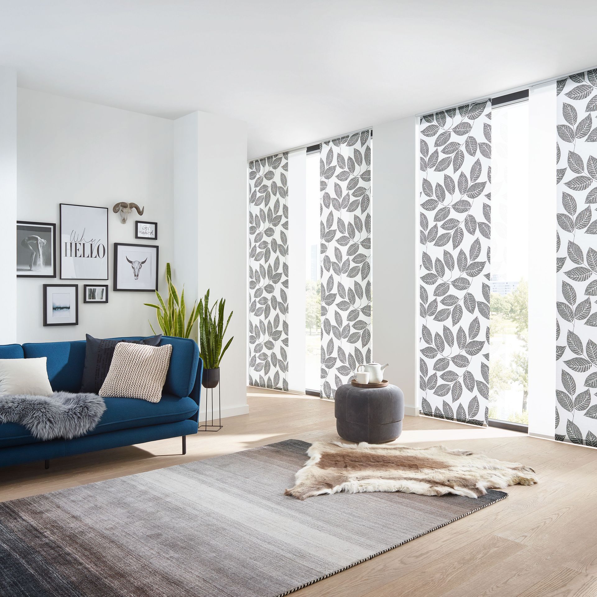 Die Paneele sind in individuellen Größen und praktisch unendlich vielen verschiedenen Stoffdesigns erhältlich. Die Paneele lassen sich einfach abnehmen und austauschen (Befestigung mittels Klettband). Die Montage der Schiebevorhänge erfolgt wahlweise an Wand oder Decke. Besonders für große Fenster, Glasfronten oder als Raumteiler bestechen Flächenvorhänge mit ihrer modernen, reduzierten Formensprache.